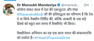देश के स्वास्थ्य कार्यकर्ताओं, वैज्ञानिकों और नागरिकों को बधाई देते हुए, मंडाविया ने कहा कि यह अभियान प्रधानमंत्री नरेंद्र मोदी के नेतृत्व में ‘सबका प्रयास’ (सभी के प्रयास) के साथ शुरू किया गया था।