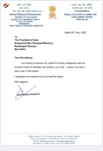 कांग्रेस के लोकसभा सांसद अधीर रंजन चौधरी, जिन्होंने नवनिर्वाचित राष्ट्रपति द्रौपदी मुर्मू को “राष्ट्रपति” कहकर विवाद खड़ा कर दिया, ने शुक्रवार को उन्हें एक पत्र में माफी जारी करते हुए दावा किया कि यह “जीभ की पर्ची” थी।