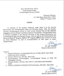 भारतीय पुरातत्व सर्वेक्षण (एएसआई) के तहत संरक्षित सभी स्मारकों में प्रवेश 5 और 15 अगस्त के दौरान ‘आजादी का अमृत महोत्सव’ अभियान और देश के 75 वें स्वतंत्रता दिवस समारोह के हिस्से के रूप में निःशुल्क होगा। केंद्रीय संस्कृति और पर्यटन मंत्री जी किशन रेड्डी ने यह जानकारी साझा की।