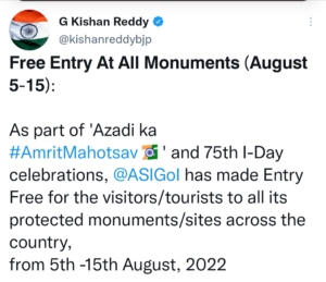 सोशल मीडिया पर सहारा लेते हुए, रेड्डी ने एएसआई के एक बयान को साझा किया जिसमें कहा गया था कि उत्सव के हिस्से के रूप में 5 से 15 अगस्त तक किसी भी टिकट वाले केंद्रीय संरक्षित स्मारकों के साथ-साथ पुरातत्व स्थल संग्रहालयों पर कोई शुल्क नहीं लिया जाएगा।
