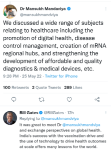ट्वीट्स के जवाब में, गेट्स ने शनिवार को कहा: “डॉ @mansukhmandviya से मिलकर और वैश्विक स्वास्थ्य पर दृष्टिकोणों का आदान-प्रदान करके बहुत अच्छा लगा। टीकाकरण अभियान के साथ भारत की सफलता और बड़े पैमाने पर स्वास्थ्य परिणामों को आगे बढ़ाने के लिए प्रौद्योगिकी के उपयोग से दुनिया को कई सबक मिलते हैं।