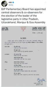 भारतीय जनता पार्टी ने सोमवार को उत्तर प्रदेश, उत्तराखंड, गोवा और मणिपुर में विधायक दल के नेता के चुनाव की निगरानी के लिए अपने पर्यवेक्षकों और सह-पर्यवेक्षकों की नियुक्ति की। भगवा पार्टी के संसदीय बोर्ड ने चार राज्यों में बढ़ रही राजनीतिक गतिविधियों के बीच सूची जारी की, जहां उसने सत्ता विरोधी लहर को दरकिनार करते हुए निर्णायक जनादेश हासिल किया है।