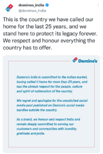 देश के बाहर डोमिनोज़ के सोशल मीडिया हैंडल पर प्रकाशित अवांछित सोशल मीडिया पोस्ट के लिए हमें खेद है और खेद है। एक ब्रांड के रूप में हम भारत का सम्मान और सम्मान करते हैं और विनम्रता, कृतज्ञता और गर्व के साथ अपने ग्राहकों और समुदायों की सेवा करने के लिए प्रतिबद्ध हैं।”