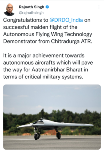 इस बीच, डीआरडीओ को बधाई देते हुए, रक्षा मंत्री राजनाथ सिंह ने ट्वीट किया, “चित्रदुर्ग एटीआर से ऑटोनॉमस फ्लाइंग विंग टेक्नोलॉजी डिमॉन्स्ट्रेटर की पहली सफल उड़ान पर @DRDO_India को बधाई। यह स्वायत्त विमानों की दिशा में एक बड़ी उपलब्धि है जो महत्वपूर्ण सैन्य प्रणालियों के मामले में आत्मनिर्भर भारत का मार्ग प्रशस्त करेगी। ”