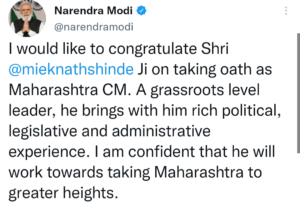 इस मौके पर पीएम मोदी ने ट्वीट कर लिखा कि मैं एकनाथ शिंदे को सीएम बनने पर बधाई देता हूं।वे जमीन से जुड़े नेता हैं. उन्हें राजनीतिक से लेकर प्रशासनिक अनुभव है। वे महाराष्ट्र को नई ऊंचाइयों पर ले जाने का काम करेंगे।