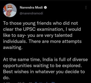 “उन युवा मित्रों से, जिन्होंने यूपीएससी परीक्षा पास नहीं की, मैं कहना चाहूंगा- आप बहुत प्रतिभाशाली व्यक्ति हैं। अभी और प्रयास किए जा रहे हैं। साथ ही, भारत विविध अवसरों से भरा है, जिन्हें तलाशने की प्रतीक्षा है। शुभकामनाएं आप जो कुछ भी करने का फैसला करते हैं, “प्रधान मंत्री, जो अमेरिका में हैं, ने एक अन्य ट्वीट में कहा।