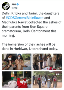 परिवार ने कहा है कि जनरल रावत और मधुलिका रावत की अस्थियां, जिनका बरार स्क्वायर श्मशान में एक ही अंतिम संस्कार किया गया था, को बाद में उत्तराखंड के हरिद्वार में गंगा में विसर्जित किया जाएगा।