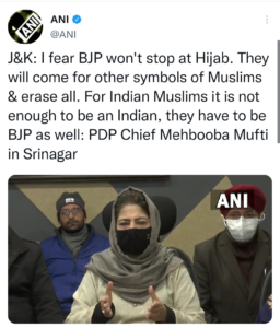 पीपुल्स डेमोक्रेटिक पार्टी (पीडीपी) के प्रमुख मुफ्ती, जो भाजपा के पूर्व सहयोगी से मुखर आलोचक हैं, जो केंद्र में भी सत्ता में हैं, ने दावा किया कि पार्टी हिजाब पर नहीं रुकेगी।