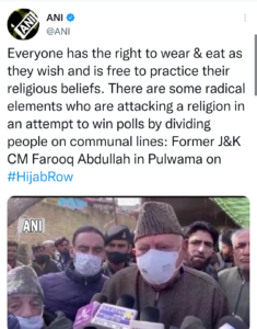 इस बीच, नेशनल कांफ्रेंस (नेकां) के अध्यक्ष फारूक अब्दुल्ला ने कहा कि हर कोई अपनी इच्छानुसार खाने के लिए पहनने और अपनी धार्मिक मान्यताओं का पालन करने के लिए स्वतंत्र है। अब्दुल्ला ने कहा, “कुछ कट्टरपंथी तत्व हैं जो लोगों को सांप्रदायिक आधार पर विभाजित करके चुनाव जीतने की कोशिश में एक धर्म पर हमला कर रहे हैं।”