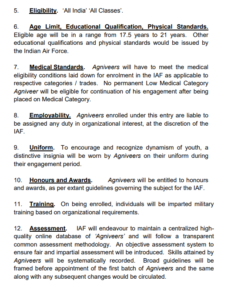 IAF ने कहा कि आयु सीमा (इस वर्ष 17.5 वर्ष से 23 वर्ष और अगले से 17.5 वर्ष से 21 वर्ष) के अलावा, आवश्यक शैक्षिक योग्यता, शारीरिक और चिकित्सा मानकों का विवरण बाद में दिया जाएगा।