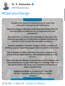 विदेश मंत्री एस जयशंकर ने शुक्रवार को युद्ध प्रभावित यूक्रेन से अपने नागरिकों को निकालने के लिए भारत द्वारा शुरू किए गए ऑपरेशन गंगा की सराहना की, क्योंकि भारतीय छात्र, जो उत्तर-पूर्वी यूक्रेनी शहर सुमी में फंसे हुए थे, विशेष उड़ानों से भारत पहुंचे।