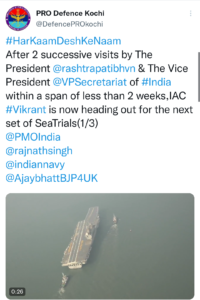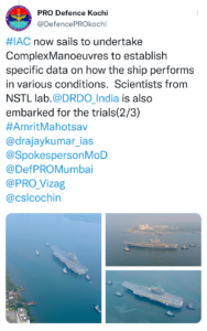 भारत में निर्मित विमानवाहक पोत विक्रांत महत्वपूर्ण समुद्री परीक्षणों के लिए रवाना हुआ