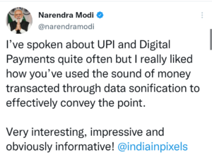 मैंने अक्सर यूपीआई और डिजिटल भुगतान के बारे में बात की है, लेकिन मुझे वास्तव में पसंद आया कि आपने प्रभावी ढंग से बात को व्यक्त करने के लिए डेटा सोनिफिकेशन के माध्यम से लेन-देन किए गए पैसे का उपयोग कैसे किया, ”पीएम मोदी ने ट्विटर पर लिखा।