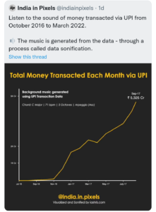 लोकप्रिय ट्विटर हैंडल, जिसके सोशल मीडिया प्लेटफॉर्म पर 91.6k फॉलोअर्स हैं, ने ‘डेटा सोनिफिकेशन’ नामक डेटा से उत्पन्न UPI के माध्यम से पैसे के लेनदेन की आवाज को साझा किया।