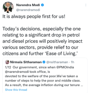 लोग हमारे लिए पहले’: वित्त मंत्री द्वारा ईंधन की कीमतों में कमी के बाद पीएम मोदी
