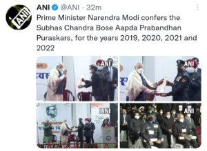 प्रधानमंत्री नरेंद्र मोदी ने रविवार को सुभाष चंद्र बोस की जयंती पराक्रम दिवस के अवसर पर ‘सुभाष चंद्र बोस आपदा प्रबंधन पुरस्कार’ से सम्मानित किया। वर्ष 2019, 2020, 2021 और 2022 के लिए पुरस्कार प्रदान किए गए, क्योंकि राष्ट्र ने स्वतंत्रता सेनानी की 125 वीं जयंती मनाई।