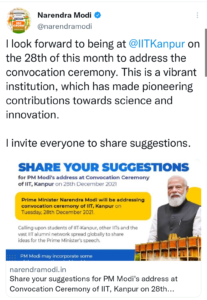 भारतीय प्रौद्योगिकी संस्थान (IIT) कानपुर के दीक्षांत समारोह में अपने संबोधन से पहले, प्रधान मंत्री नरेंद्र मोदी ने बुधवार को आगामी भाषण के लिए विचारों को आमंत्रित करने के लिए ट्विटर का सहारा लिया।