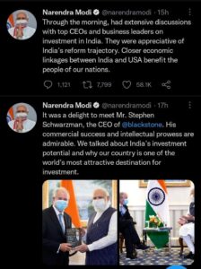 संयुक्त राज्य अमेरिका के तीन दिवसीय दौरे पर आए प्रधान मंत्री नरेंद्र मोदी ने बुधवार को कहा कि शीर्ष अमेरिकी सीईओ ने भारत के सुधार उपायों की सराहना की। प्रधान मंत्री ने भारत में निवेश पर अमेरिकी सीईओ और व्यापारिक नेताओं के साथ बैठकें कीं। पीएम मोदी ने ट्वीट किया, “सुबह के दौरान, भारत में निवेश पर शीर्ष सीईओ और व्यापार जगत के नेताओं के साथ व्यापक चर्चा हुई। वे भारत के सुधार प्रक्षेपवक्र की सराहना कर रहे थे। भारत और अमेरिका के बीच घनिष्ठ आर्थिक संबंध हमारे राष्ट्रों के लोगों को लाभान्वित करते हैं।”