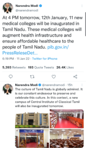 मंगलवार को ट्विटर पर पीएम मोदी ने कहा कि नए मेडिकल कॉलेज “स्वास्थ्य के बुनियादी ढांचे को बढ़ाएंगे और तमिलनाडु के लोगों के लिए सस्ती स्वास्थ्य सेवा सुनिश्चित करेंगे।”