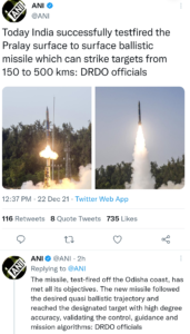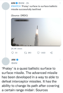 प्रलय मिसाइल का सफल परीक्षण, ‘उच्च’ सटीकता के साथ निशाना साधा: DRDO