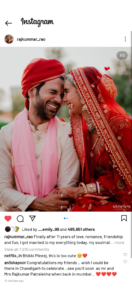 मुंबई – 11 साल तक एक दूसरे को डेट करने के बाद राजकुमार राव और पत्रलेखा ने शादी कर ली है। कपल ने सोमवार को चंडीगढ़ में शादी के बंधन में बंध गए।