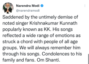 दिवंगत गायक को श्रद्धांजलि देने के लिए प्रधानमंत्री नरेंद्र मोदी ने देश का नेतृत्व किया। “केके के नाम से मशहूर प्रसिद्ध गायक कृष्णकुमार कुन्नाथ के असामयिक निधन से दुखी हूं। उनके गीतों ने भावनाओं की एक विस्तृत श्रृंखला को दर्शाया, जो सभी आयु वर्ग के लोगों के साथ जुड़ा हुआ था। हम उन्हें उनके गानों के जरिए हमेशा याद रखेंगे। उनके परिवार और प्रशंसकों के प्रति संवेदना। ओम शांति, ”वह ट्विटर पर लिखते हैं।