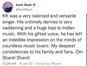 गृह मंत्री अमित शाह ने भी ट्विटर पर गायक के “असामयिक निधन” पर शोक व्यक्त किया। “केके एक बहुत ही प्रतिभाशाली और बहुमुखी गायक थे। उनका असामयिक निधन बहुत ही दुखद और भारतीय संगीत के लिए एक बहुत बड़ी क्षति है। अपनी प्रतिभाशाली आवाज से उन्होंने अनगिनत संगीत प्रेमियों के मन पर एक अमिट छाप छोड़ी है। उनके परिवार और प्रशंसकों के प्रति मेरी गहरी संवेदना है। शांति शांति।”