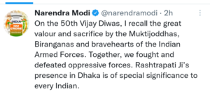 50वें विजय दिवस के अवसर पर, मैं मुक्तिजोधों, वीरांगनाओं और भारतीय सशस्त्र बलों के वीरों द्वारा महान वीरता और बलिदान को याद करता हूं। हमने साथ मिलकर दमनकारी ताकतों से लड़ाई लड़ी और उन्हें हराया। ढाका में राष्ट्रपति जी की उपस्थिति प्रत्येक भारतीय के लिए विशेष महत्व रखती है,” पीएम मोदी ने ट्विटर पर लिखा।