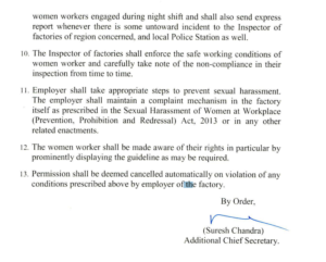 आदेश में लिखा था, “शाम 7:00 बजे से 6:00 बजे के बीच काम करने वाली महिला श्रमिकों को कारखाने के नियोक्ता और वापस उनके आवास से कार्यस्थल तक मुफ्त परिवहन प्रदान किया जाएगा। … नियोक्ता कार्यस्थल में शौचालय, वाशरूम, चेंजिंग रूम, पीने की सुविधा और रोशनी सुनिश्चित करेगा।