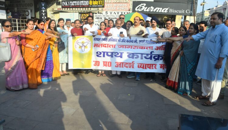 लखनऊ. निकाय चुनाव में मतदान प्रतिशत बढ़ाने के उद्देश्य से शुक्रवार को राजधानी से”उत्तर प्रदेश आदर्श व्यापार मंडल” ने ” मतदाता जागरूकता अभियान” शुरू किया. उत्तर प्रदेश आदर्श व्यापार मंडल के बैनर तले व्यापारियों ने नगर निकाय चुनाव में अनिवार्य मतदान की शपथ ली ,संगठन के प्रदेश अध्यक्ष संजय गुप्ता ने व्यापारियों को अनिवार्य मतदान की शपथ दिलाई.