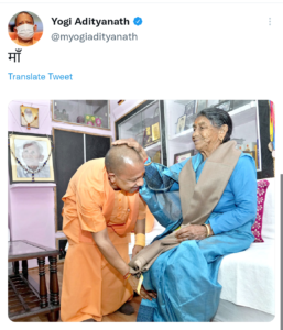 उत्तर प्रदेश के मुख्यमंत्री ने एक तस्वीर ट्वीट की जिसमें वह अपनी मां के पैर छूकर उनका आशीर्वाद लेते नजर आ रहे हैं।